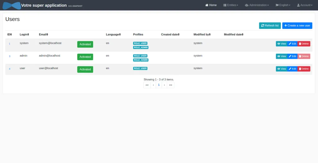 Pour la gestion du contenu de l’application web, JHipster propose une page de création, visualisation et édition des données (aussi appelées entités). Par exemple, si votre application gère des commandes, lors de la génération de l’entité Commandes, une page en fera le listing, et il sera aussi possible de les éditer.